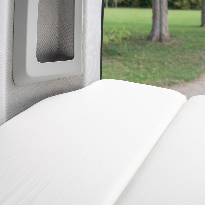 Ein Rundumgummi sowie zusätzliche Befestigungsgummis (nur bei Weiß) mit praktischer Druckknopflasche sorgen für einen noch besseren Halt beim Hockklappen des Heckbetts, um den Heckladeraum zu vergrößern. Die Befestigungsgummis können vor dem Waschen problemlos entfernt werden.